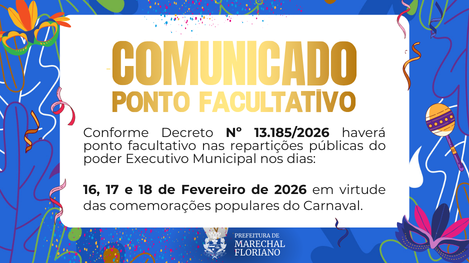 Read morePonto facultativo nas repartições públicas municipais de Marechal Floriano nos dias 16, 17 e 18 de fevereiro de 2026, em