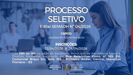 Processo Seletivo Edital SEMADH Nº 04/2026! O cargo é para Assistente Administrativo. 📅 Período de Inscrições: 22/04/2026 a 24/04/2026 🕒