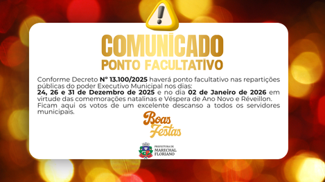 Ponto facultativo nas repartições públicas municipais de Marechal Floriano nos dias 24, 26 e 31 de dezembro de 2025 e 2 de janeiro de 2026 para que todos possam celebrar, descansar e recarregar as energias, com votos de um Novo Ano de muitas conquistas, saúde e prosperidade a todos!